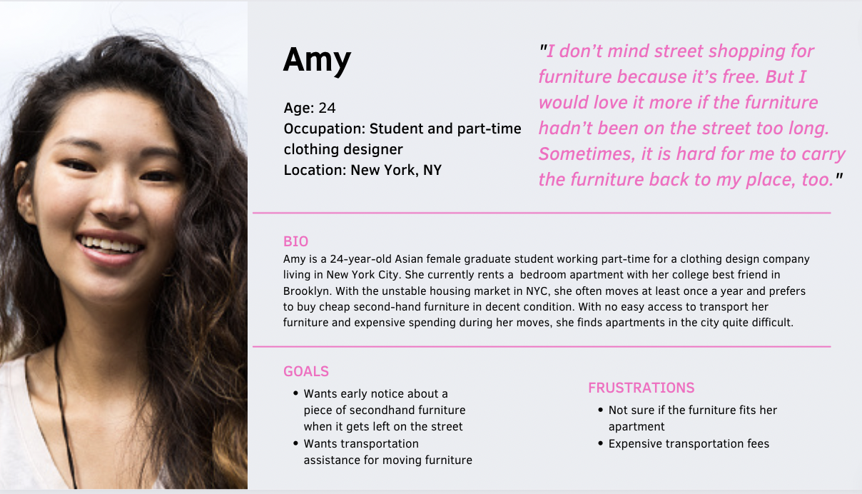 This survey aims to gather New Yorkers’ attitudes about secondhand furniture shopping, their views on the current alternatives, and concerns about the topic. Survey results will help us to learn more about our target group and future users.
